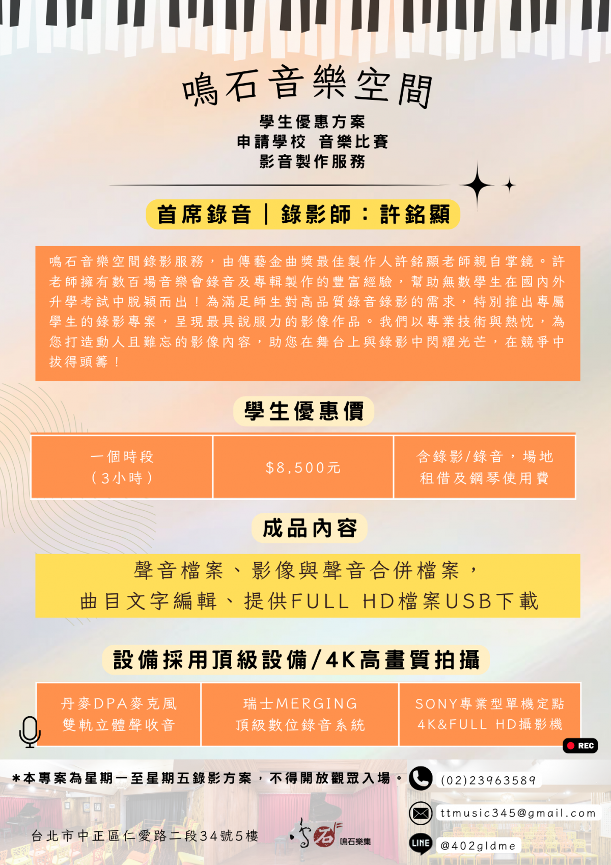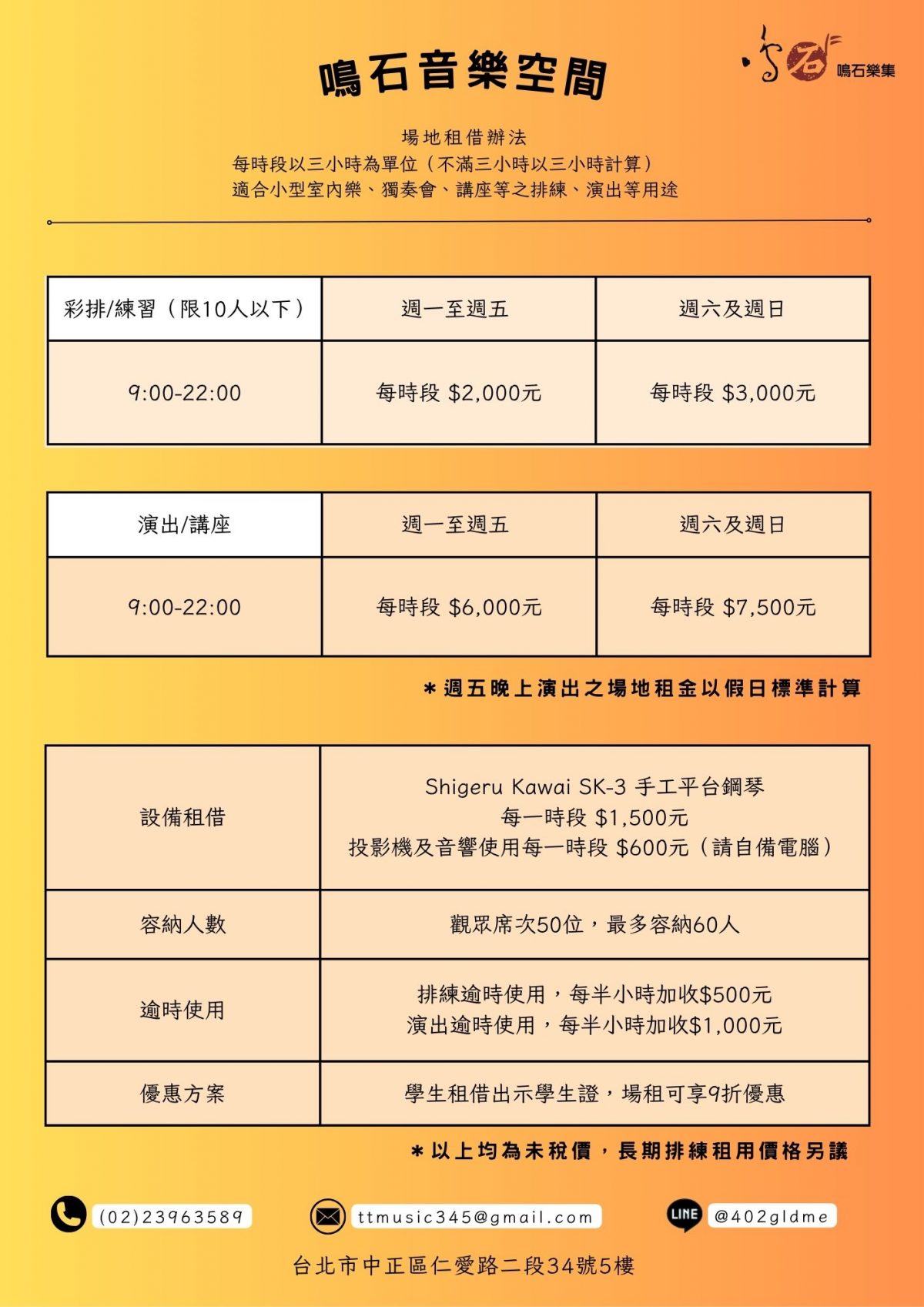 場地預約 點我申請 場地租借辦法 以上均為未稅價,長期排練價格另議。 申請方式與事項 (一)音樂活動申請單位需於前14日提出申請,並付清訂金,使得保留預約時段。(二)申請方式:請填寫Google 表單,並加入官方LINE,ID@402gldme(三)訂金:須於申請三日內繳付租借費用之30%。(四)場租:需於租用7日前繳清尾款。(五)因故取消場地租借,請於租用日前7天提出申請,未完成變更取消手續將沒收訂金。 點我申請