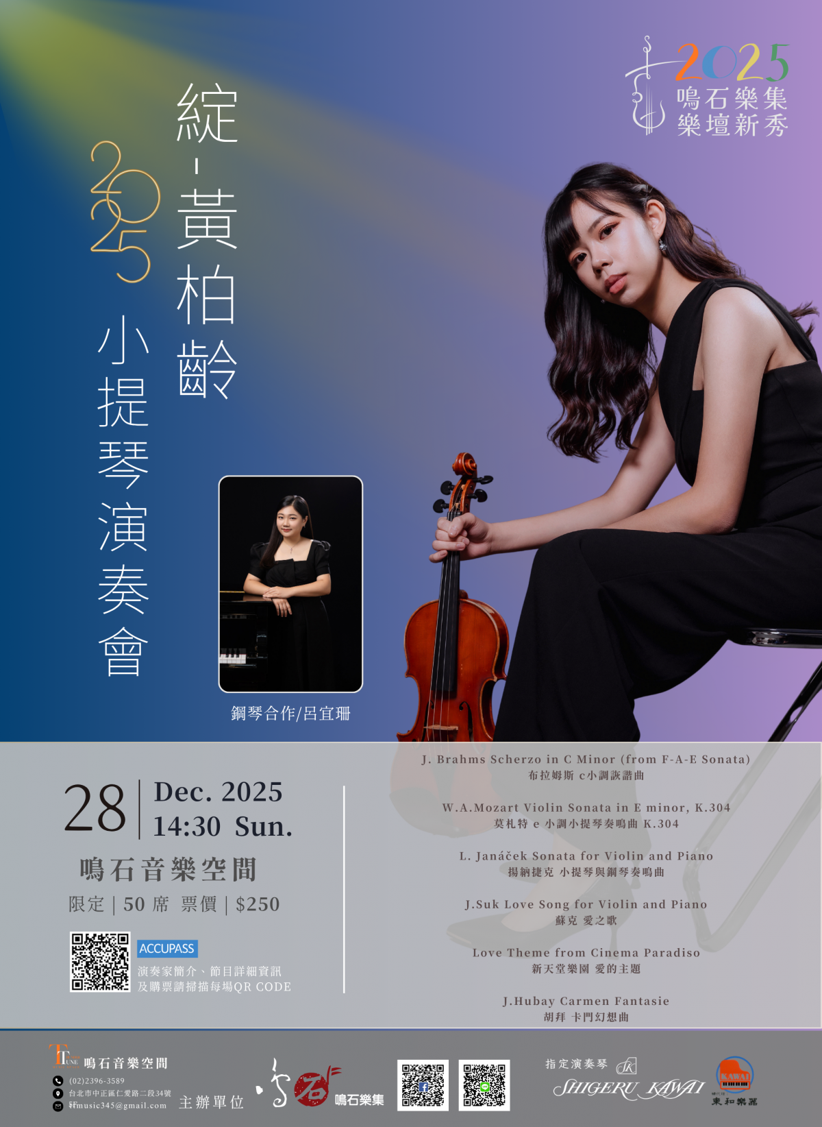 這次的演出曲目,從青年布拉姆斯為摯友小提琴家姚阿幸所創作的的c小調詼諧曲出發,此曲源自標題為「F-A-E」(frei,aber einsam 自由但孤單)的奏鳴曲第三樂章,接著是莫札特充滿哀愁與思念的e小調小調奏鳴曲K304。