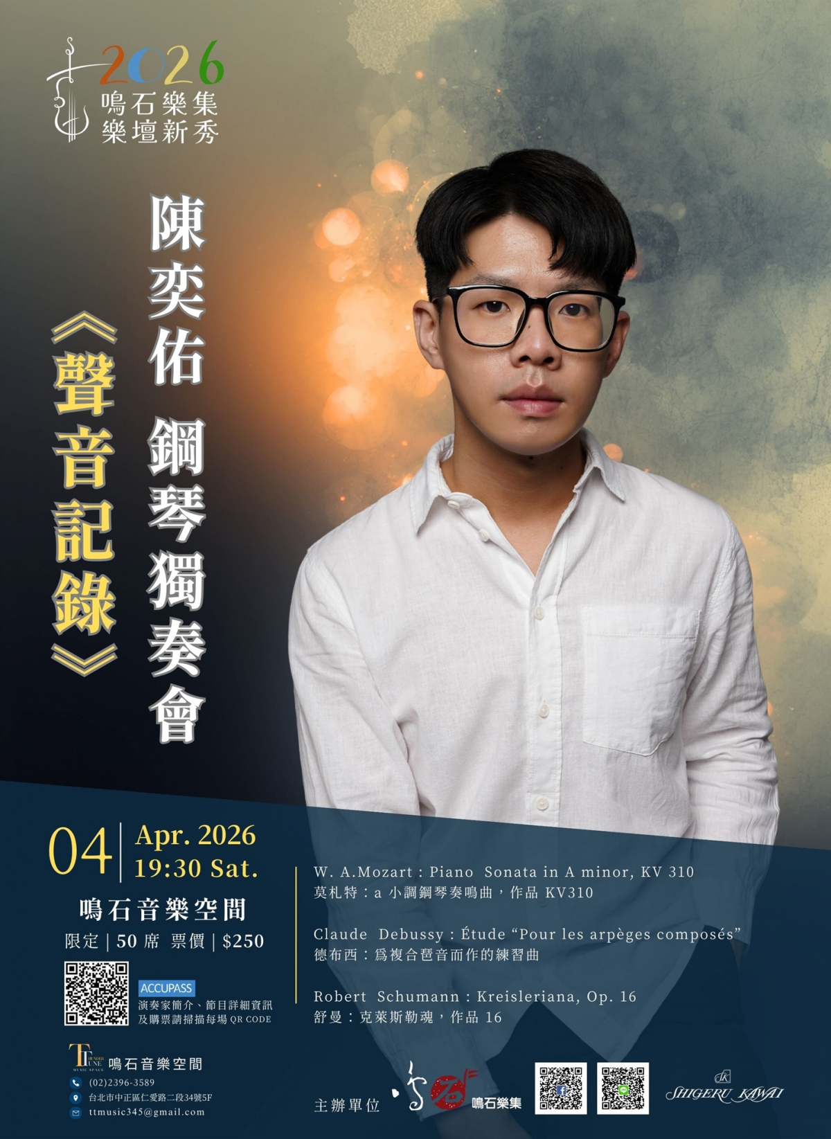 本場節目由三部作品構成,連結陳奕佑在 奧地利、法國與德國多年生活的經驗。這些聲音像被時間悄悄留下的痕跡, 紀錄了在不同地方度過的日常與其微弱的溫度。莫札特 a小調奏鳴曲以緊繃的能量與深層陰影開場,映照在奧地利求學時無聲累積的情緒。德布西的練習曲呼應法國生活中的光線與空氣, 聲響移動輕微, 像城市節奏下柔和而短暫的片刻。舒曼《克萊斯勒魂》則回映在德國生活的多層風景,碎裂與凝聚交替,如夜色裡緩緩散開的思緒。