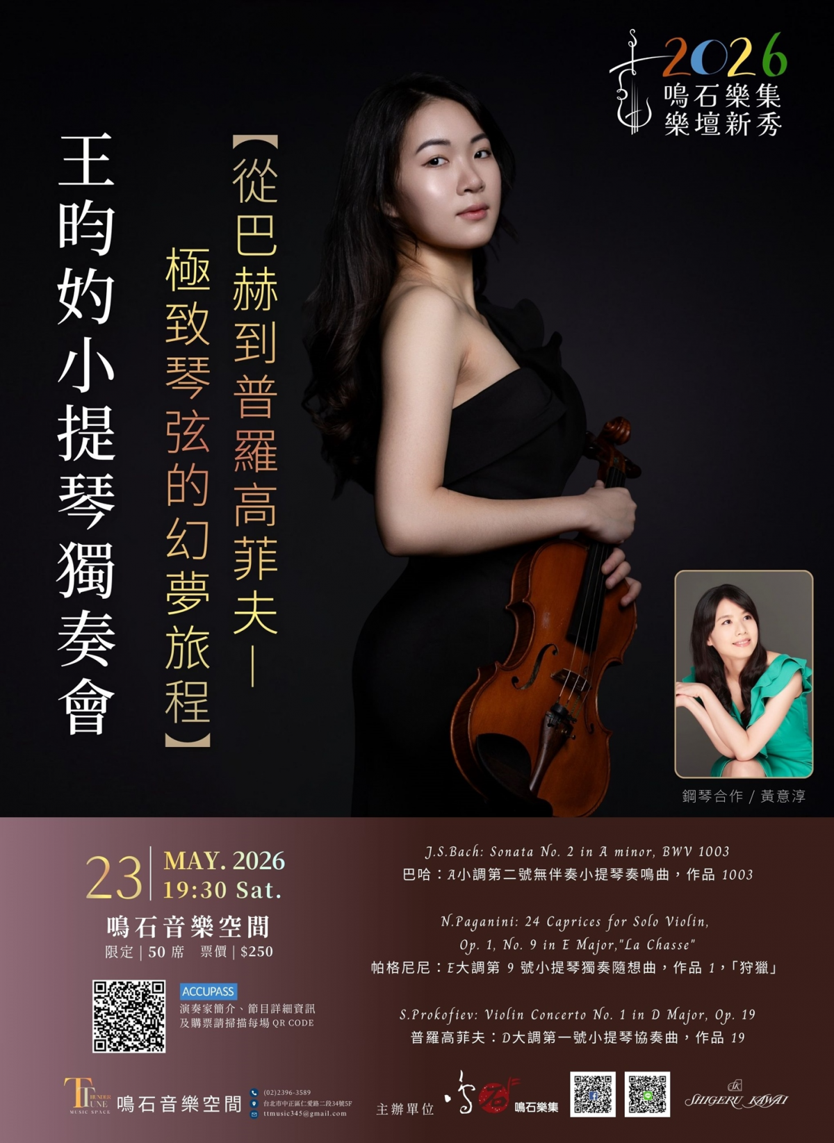 本場音樂會,昀妁將挑戰極具張力的曲目跨度:從巴赫無伴奏中嚴謹且壯闊的四聲部賦格,到帕格尼尼《狩獵》中令人屏息的華麗技巧。下半場則聚焦於普羅高菲夫《第一號小提琴協奏曲》,這部作品以空靈如夢、忽而凌厲諷刺的獨特風格著稱,是展現演奏家色彩控制力的最高殿堂。透過細膩且具爆發力的琴音,昀妁將帶領您親歷一場從理性建築走向詩意幻境的聽覺盛宴。