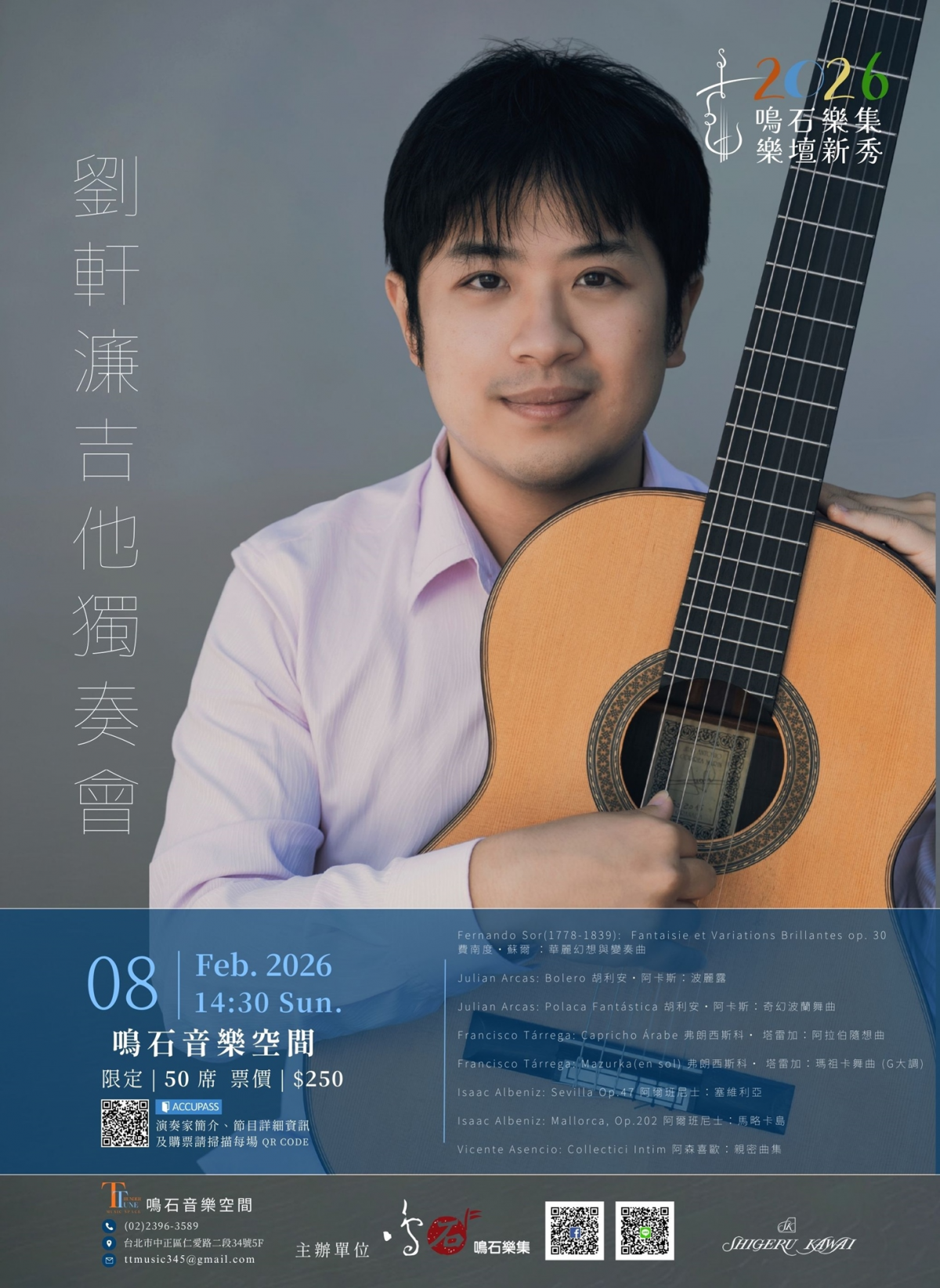 本場音樂會將帶領聽眾走入橫跨兩世紀的西班牙吉他之旅。從 Fernando Sor 以古典結構與優雅對位奠定吉他藝術基礎的《華麗幻想與變奏曲》,到 Julian Arcas 融合舞曲節奏與浪漫情感的《波麗露》與《奇幻波蘭舞曲》,展現十九世紀中期吉他逐漸邁向沙龍音樂與民族風格的轉折。Tárrega 的《阿拉伯隨想曲》與《瑪祖卡舞曲》則象徵吉他進入抒情與詩意的黃金時期。Albeniz 的鋼琴名作《塞維利亞》與《馬略卡島》在吉他上重現西班牙靈魂的熱烈與憂愁,延續至二十世紀 Vicente Asencio 的《親密曲集》,以印象派筆觸描繪加泰隆尼亞的情感風景。從古典理性到浪漫詩意,再至現代內省,吉他在這片土地上,始終以最人性的聲音,訴說西班牙的靈魂。