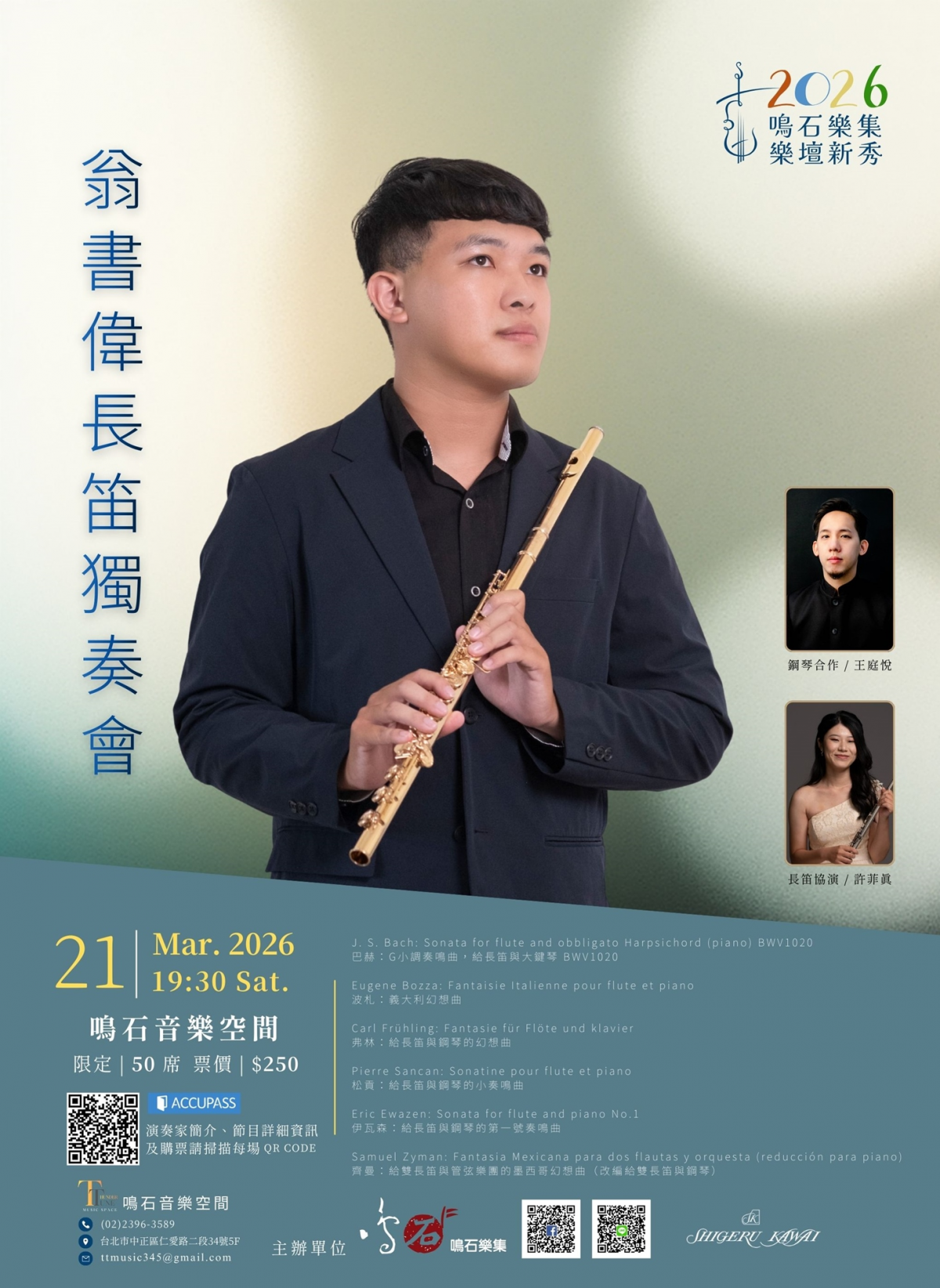 本場音樂會涵蓋了巴洛克、浪漫、現代的長笛作品,第一首帶來的是巴赫的長笛奏鳴曲,是巴洛克時期一首經典的長笛作品。緊接著將帶來法國作曲家波札的義大利幻想曲,這首曲子原先是寫給單簧管,後來作曲家本人將這首熱門作品也同樣寫給其他木管樂器,曲風多變,令人彷彿置身於義大利的農田,上半場則是以弗林的幻想曲結尾,此曲時而明亮、時而憂傷,當中的情緒轉折,似乎在抒發著作曲家的情懷。